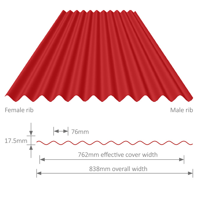The sheeting will be the Corrugated Profile as manufactured by Safintra Roofing. The rib height shall be 17.5mm and shall be fixed in accordance with the manufacturer’s recommendations.