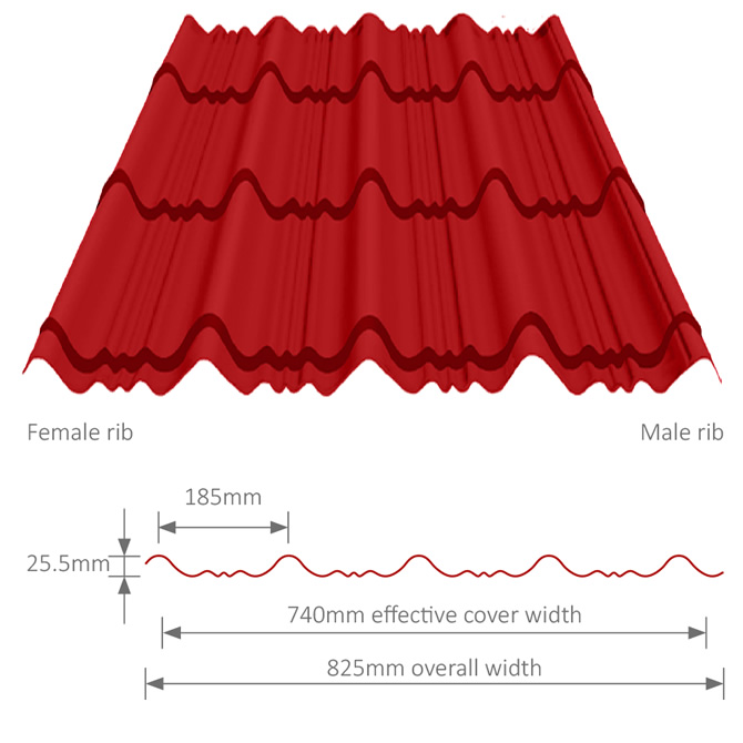 Versatile roof tile is metal roof sheeting shaped to look like a roof tile. The flexibility of steel makes this tile profile suitable for over-roofing of thatched roofs, round or curved roofs and otherwise limiting roof shapes. Versatile roof tiles is available in pre-painted galvanized iron or various “colorplus” roof tile colours.